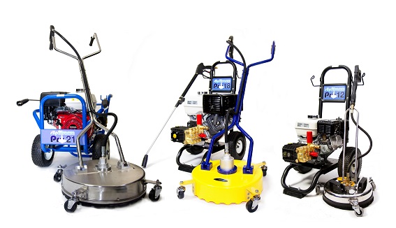 We use high pressure equipment, the pressure washer operates at 3300 psi (250 bar) and we use the rotary hard surface cleaner system to clean driveways and patios.