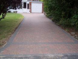 The ACRYLIC sealant shown in the picture to the left is the low cost option and is a two-coat process using a solution of an acrylic polymer in xylene. The polymer solution soaks into the jointing sand and the blocks, then after solvent evaporation it is left firmly bonded and coated. This has a stabilising effect on the driveway, preventing loss of the actual jointing sand and inhibiting the growth of weeds and grass in the joints. This sealing process also helps to prevent the colonisation of ant nests. The matt-look finish given to the surface enhances the appearance of the of the driveway considerably and has a life expectancy of 1 to 3 years dependent on local conditions.